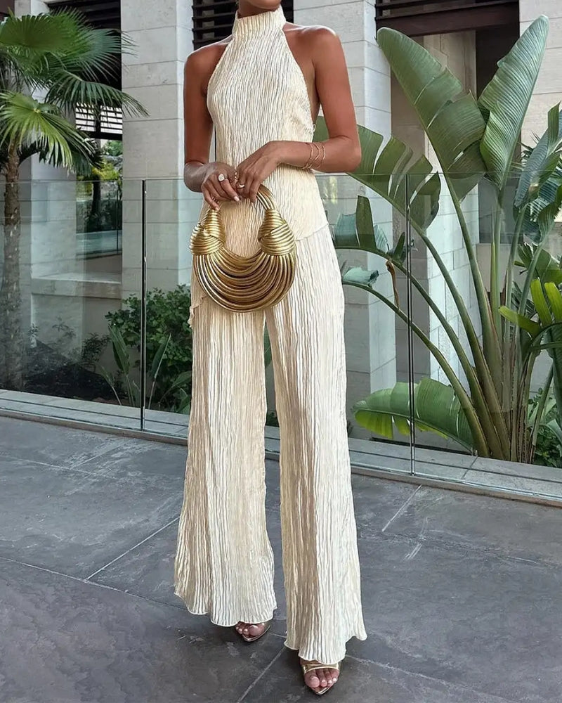 Buksedragt til kvinder – To-delt plisseret sæt med halterneck U-udskæring