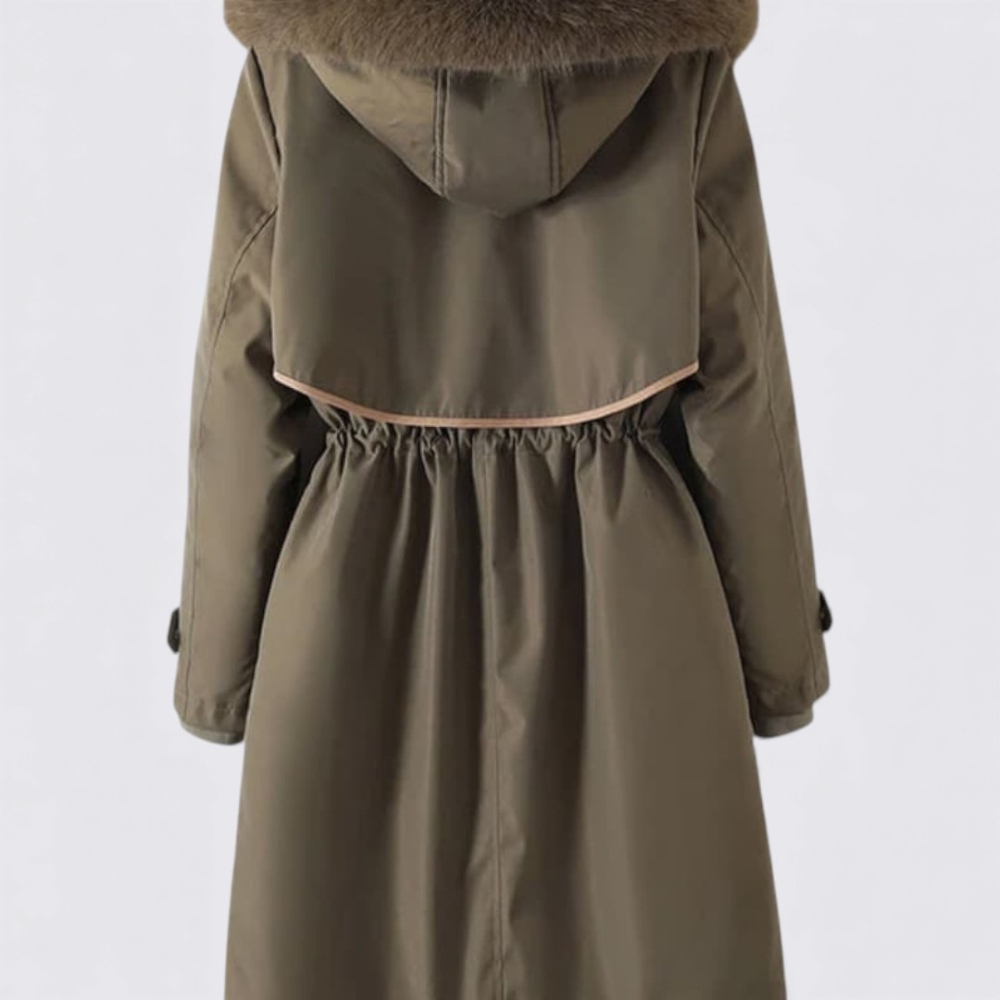 Hætte med kravekant: En markant detalje, der giver frakken karakter og harmonisk afrunder helhedsindtrykket.