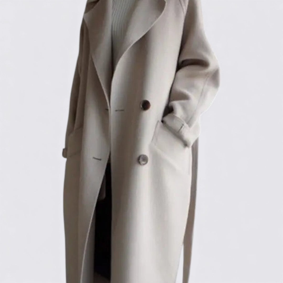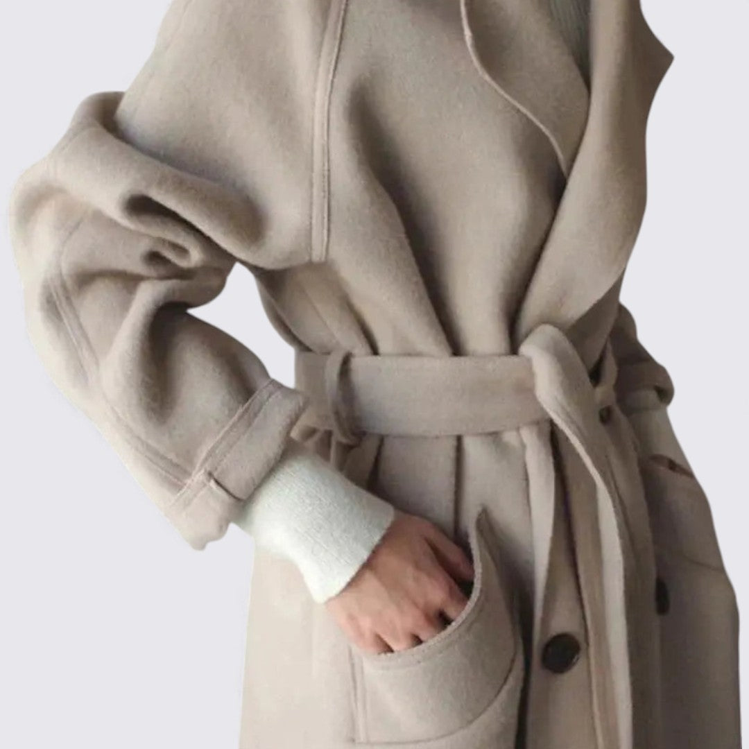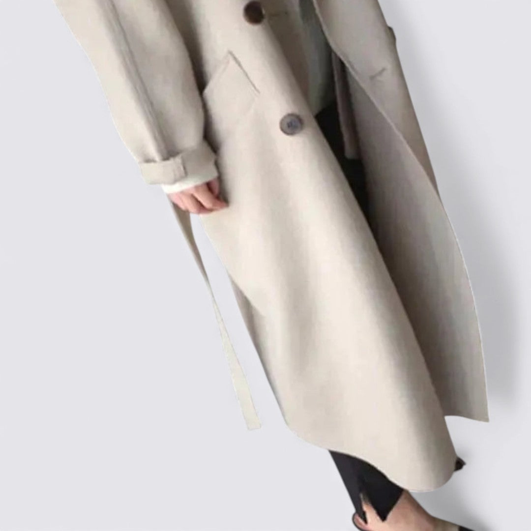 Oplev en frakke, der overbeviser med sin klare udstråling og tidløse effekt. Denne lange model med knaplås og lange ærmer viser en rolig, flydende silhuet med åben fald. Den følger selvbevidst med dig i hverdagen, uanset om det er på kontoret, i byen eller ved pæne aftaler.