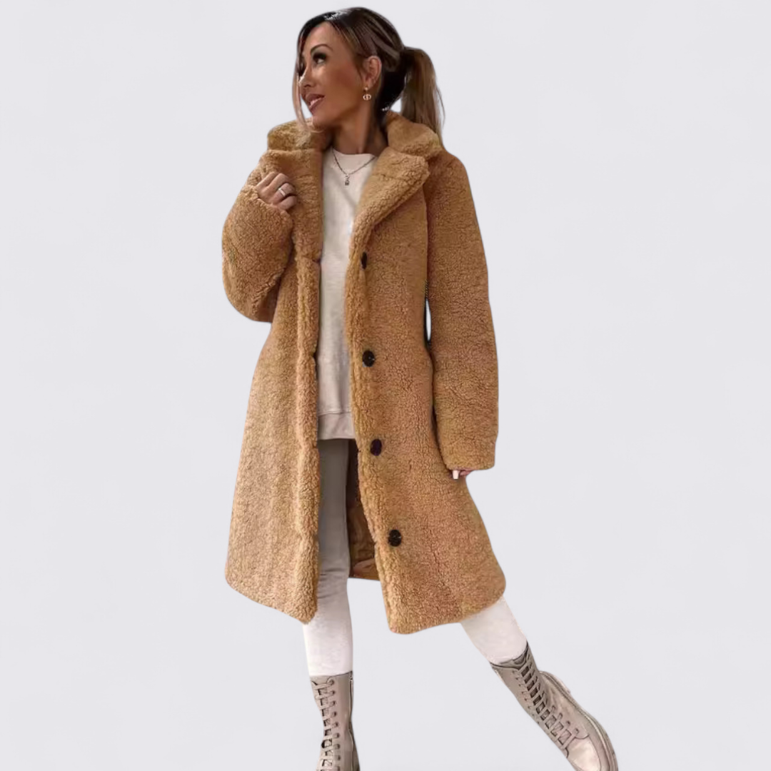 Damefrakke med knapliste – Teddyfrakke – Skåret til over låret