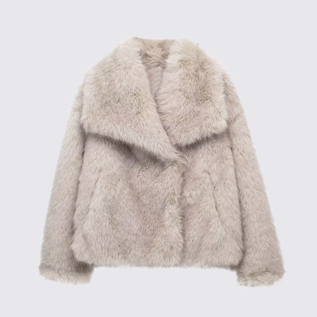 Oplev en kort frakke, der imponerer med sit udtryksfulde udseende. Denne model har reverskrave, kort længde og en overflade i kunstpels, der giver helhedsindtrykket dybde. Frakken er velegnet til hverdag, til byen eller til særlige anledninger og sætter stilfulde accenter.