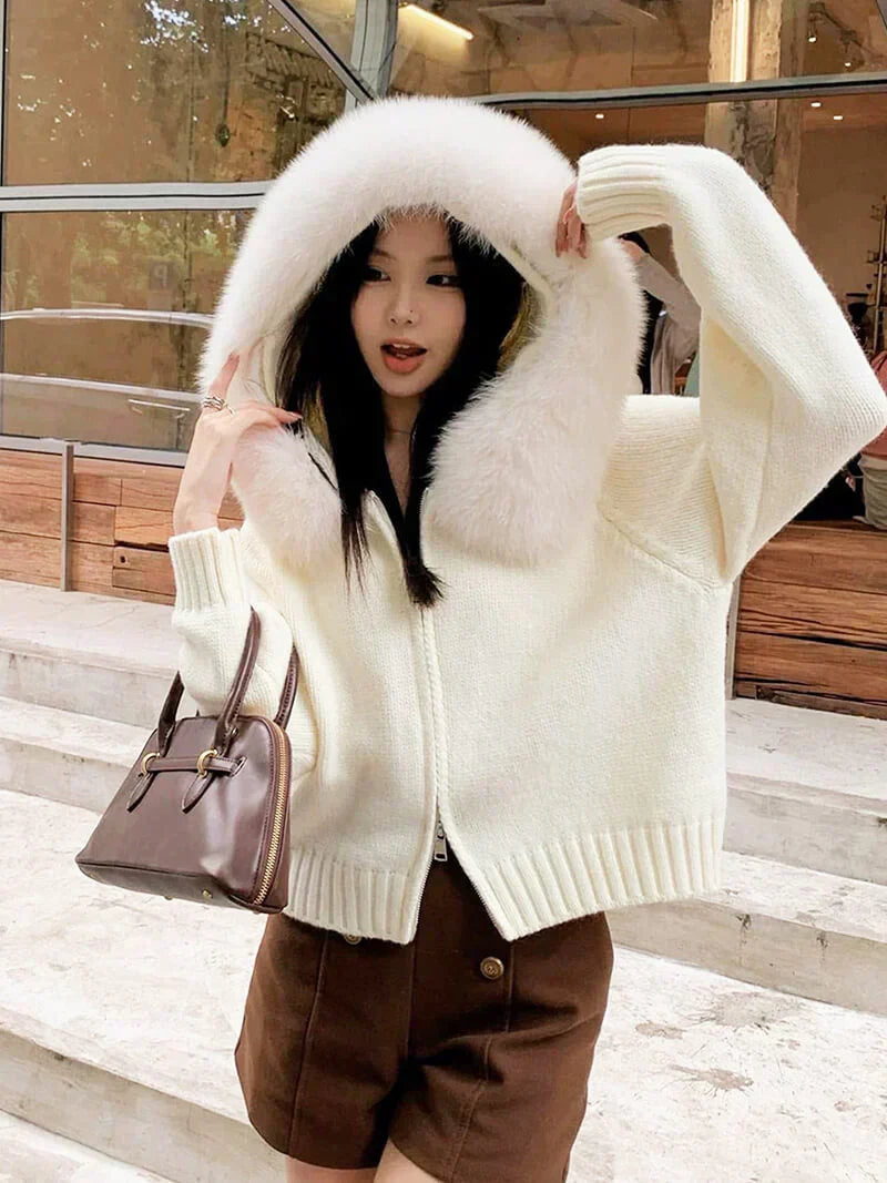 Dame strikjakke grå med hætte & kunstpels – varm vinterjakke