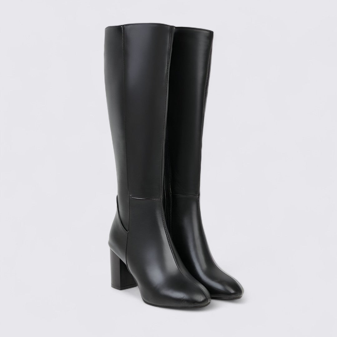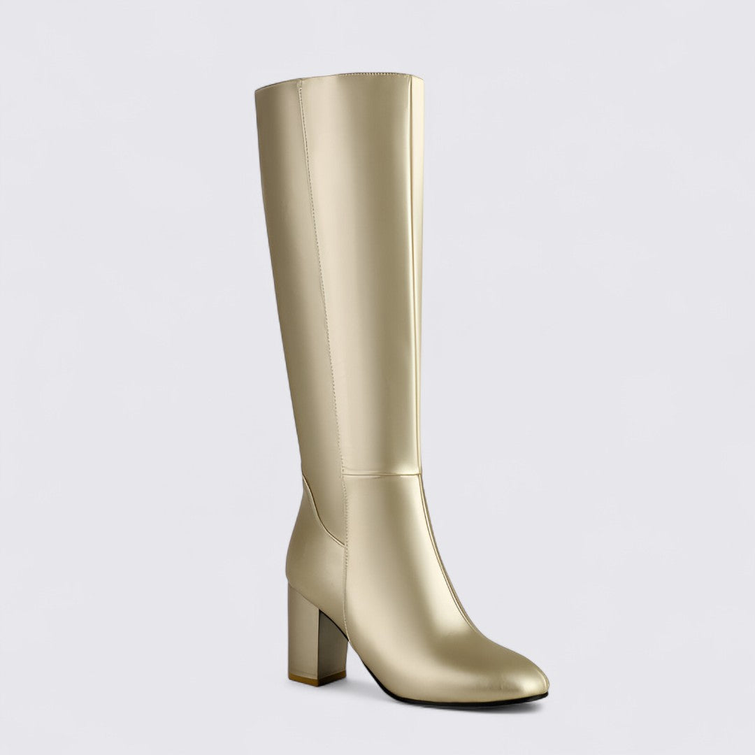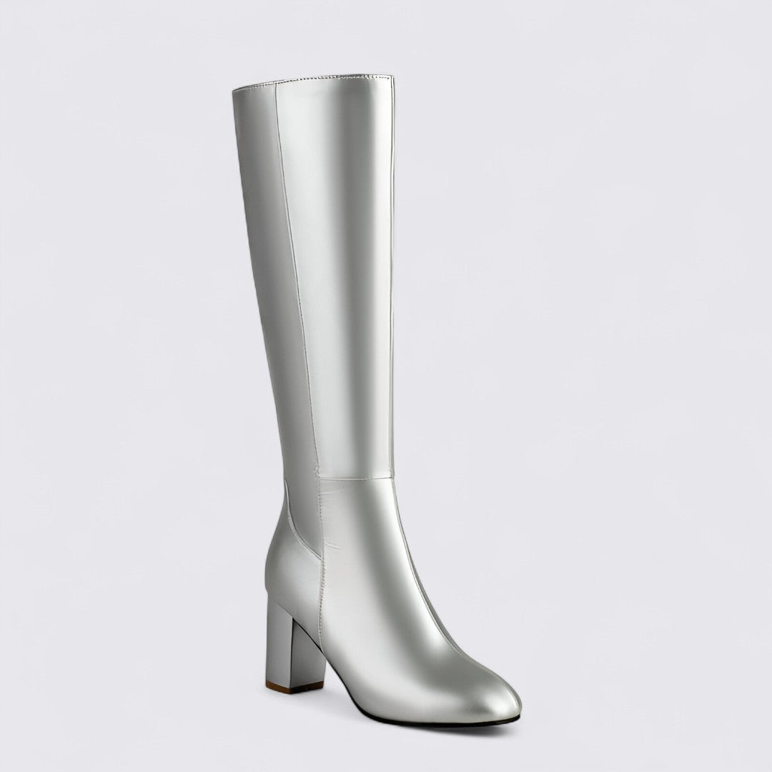 Disse knæhøje støvler præsenterer sig med en glat overflade og en fast blokhæl, der giver modellen en afbalanceret silhuet. Den høje skaft rammer benet på en rolig måde og kan ideelt bæres til kjoler, nederdele eller tætsiddende bukser – passende til kontoret, byture eller velplejede hverdagsøjeblikke.