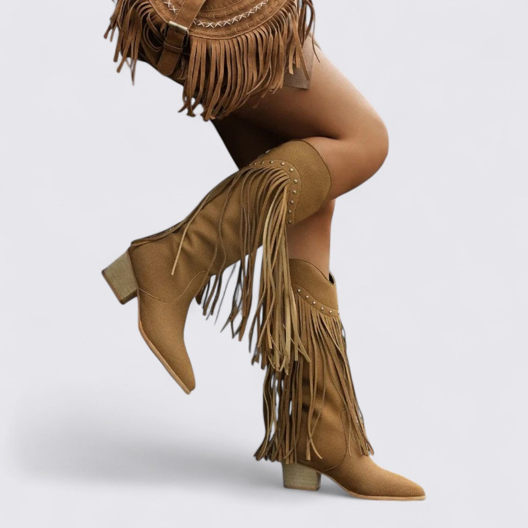 Frynser langs skaftet: De bevægelige detaljer giver støvlen dynamik og sætter et karakteristisk præg.