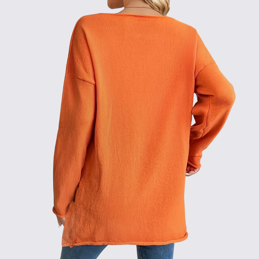 Opdag en sweater, der stilfuldt ledsager din hverdag. Den fremtrædende V-hals og de afslappede dropped shoulders skaber en rolig silhuet; et frontprint med tekst giver en diskret accent. Dette beklædningsstykke er ideelt til kontoret, bytur eller sammenkomster med venner – især i overgangsperioden.