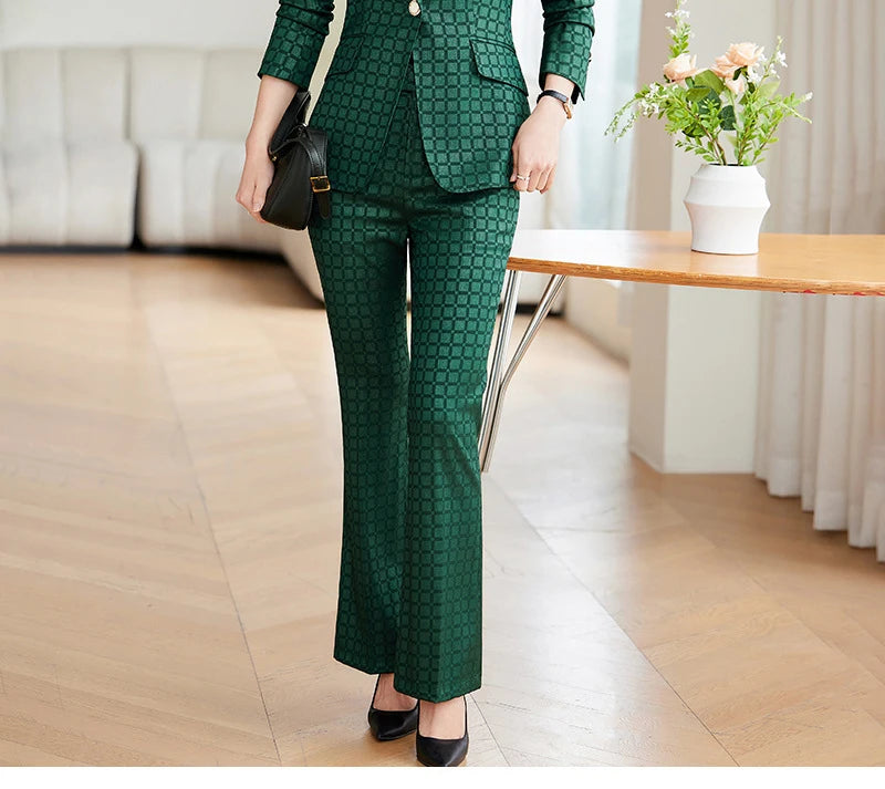 Oplev en ny dimension af sofistikeret mode med dette elegante bukse- og blazersæt designet til den moderne kvinde. Med en luksuriøs finish og et snit, der fremhæver dine naturlige kurver, fremstår du selvsikker og professionel i enhver situation.
