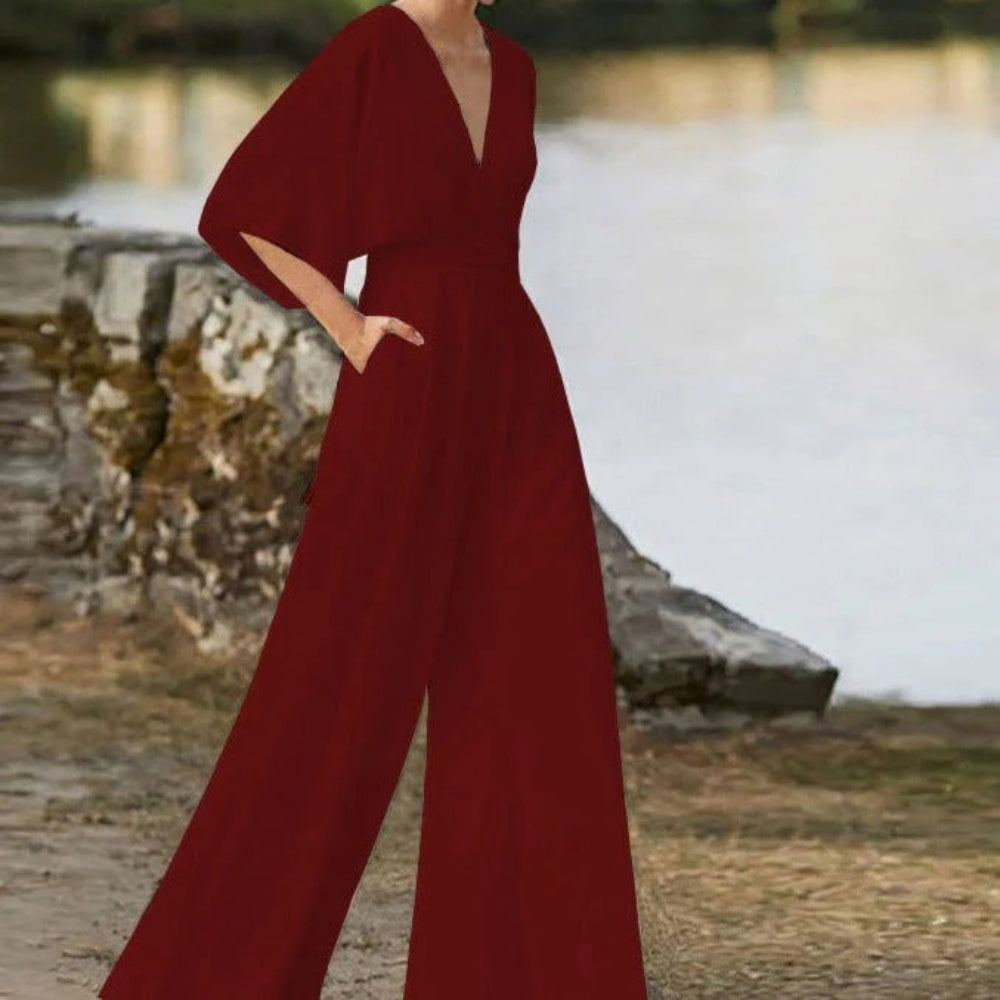 Denne overall forener en stilfuld silhuet med behagelig bærekomfort. V-udskæringen og de halve ærmer giver en tidløs stil, der kan kombineres på mange måder. Ideel til hverdag eller særlige lejligheder tilbyder den lethed og elegance på samme tid - perfekt til forår og sommer.