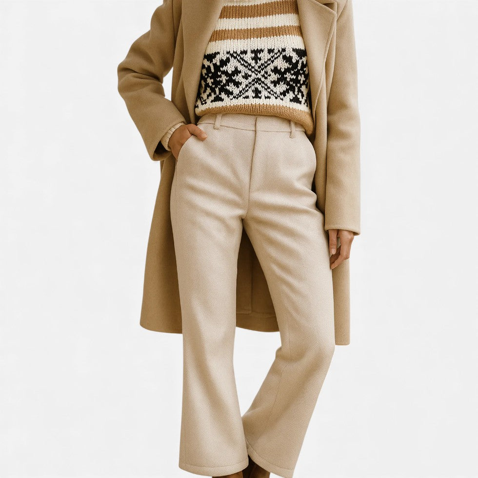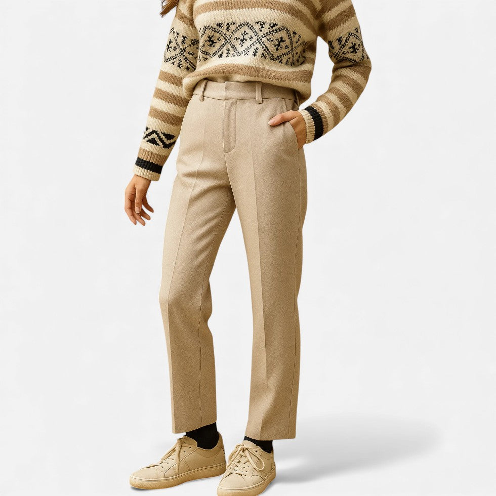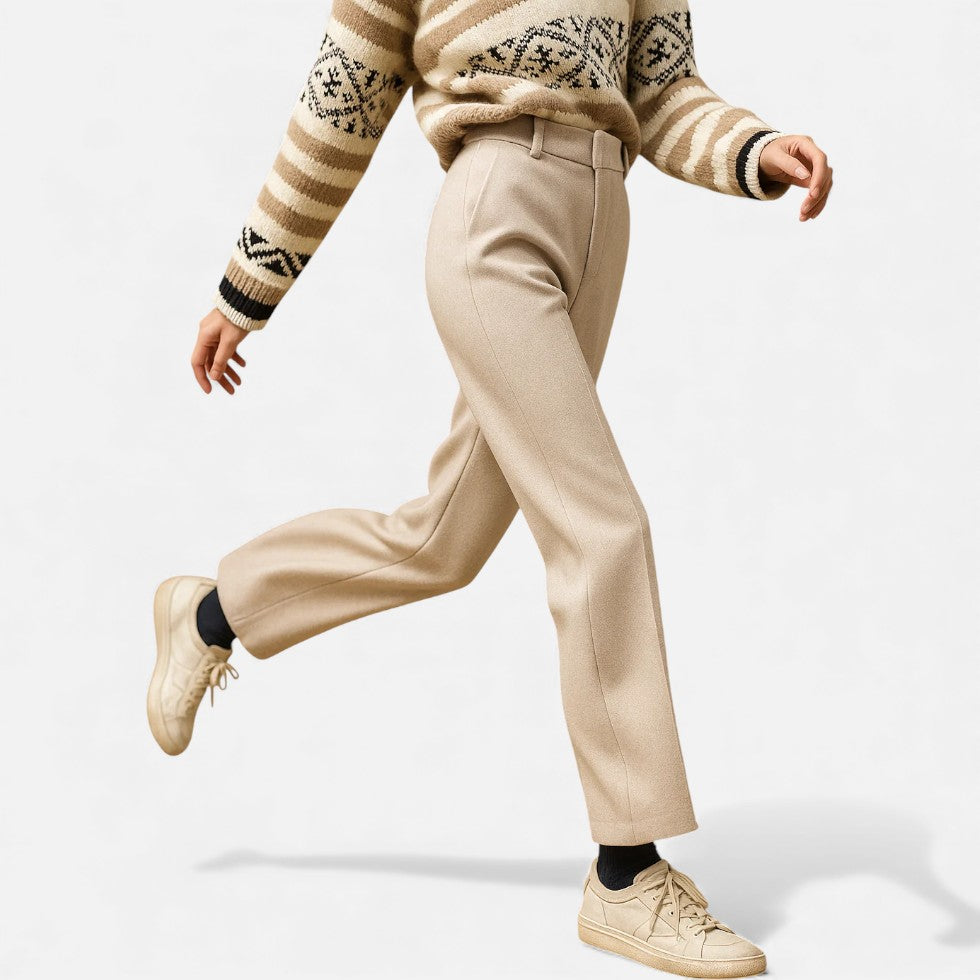 Disse bukser kombinerer en klar, moderne linje med et klassisk hørmønster. Den glatte tekstur og lige snit giver looket et pænt og alsidigt udseende. Takket være den komfortable materialeblanding er bukserne ideelle til kontoret, hverdagsbrug eller enkle aftenoutfits.