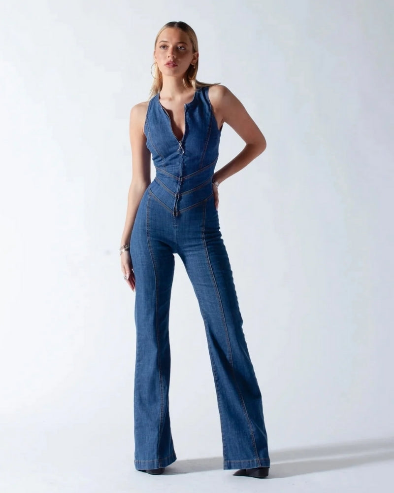 Denne overall kombinerer et klart retro-look med praktisk funktionalitet. Den hjerteformede rygudskæring sætter et markant præg, mens de V-formede sømme i taljen understøtter en defineret silhuet. En dyb V-udskæring foran og O-ring lynlåsen supplerer designet med et præcist detaljer. Alsidig og kan kombineres på mange måder, egner overallen sig til forskellige anledninger og stilarter.